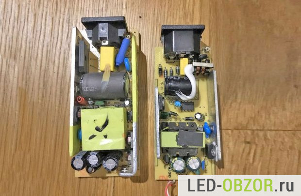 Рассмотрим фото, на котором показаны 2 блока питания, фирменный справа и Aliexpress слева. У них заявлены одинаковые параметры 12В 5A. Даже без микроскопа видно большое отличие, у фирменного в 2 раза больше размер конденсаторов, трансформатора и алюминиевых радиаторов в виде пластин.