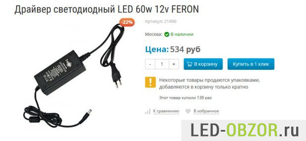 Например, блок питания 12В 60W от Feron стоит 534 руб. плюс доставка. У китайца за 534 руб. можно купить с такими же заявленными параметрами, но реально максимальная сила тока там будет 50%-80% от обещанного. При этом доставка с Алиэкспресс будет бесплатной.