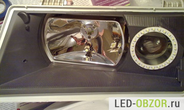 Затем измеряют диаметр посадочного места и делают установку ангельских глазок. Обезжиривают места склейки и фиксируют детали. В комплекте часто бывает двухсторонний скотч для монтажа, но я ему не доверяю. Галогенная лампа ближнего света в фаре сильно нагревается и воздействует на этот скотч.