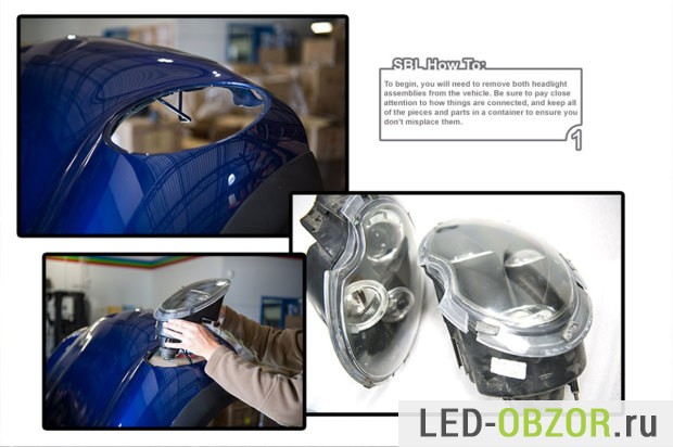 Установка ангельских глазок своими руками достаточно сложная, требуется навык, иногда и хорошие нервы. Для монтажа требуется разборка каждой фары головного света. Большинство фар собраны на герметике, который при нагреве строительным феном размягчается. Гораздо реже встречаются на герметике который представляет из себя резину. Он ничем не плавится и не размягчается, приходится несколько часов его аккуратно выковыривать и разрезать. На одну фару может уйти от 1 до 5 часов. Первый раз у меня ушло около 10 часов на разбор. По неопытности можно испортить товарный вид в районе соединения стекла и корпуса.
