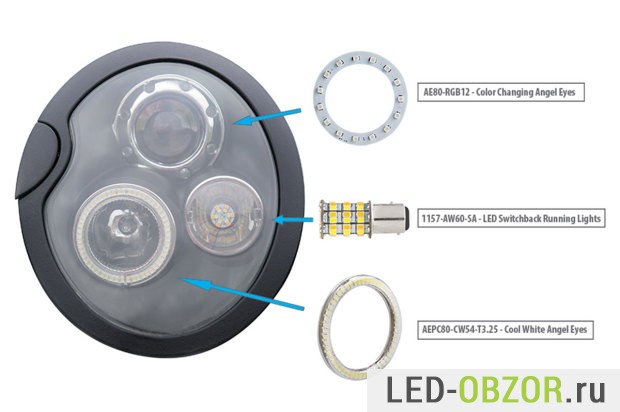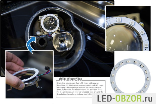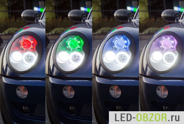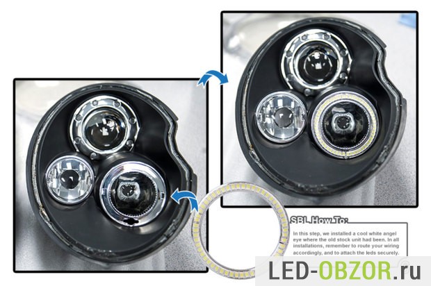 В интернете самый популярный вариант изготовления светодиодных ангельских глазок своими руками из прозрачного оргстекла или пластика. На него наносят неглубокие углубления, а с торцов вставляют светодиоды на 0,2 или 0,5 Ватта. Как вы понимаете, мощность слишком мала, свет будет рассеиваться вперёд и внутрь, и снижаться внутри прозрачного материала. Такое светодиодное кольцо полноценно будет видно только ночью, яркость на уровне обычного габарита.Даже не помогут мощные LED диоды на 1W, 3W, 5W.