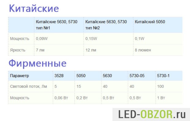 Чтобы вам было понятней посмотрите отличие характеристик китайских и фирменных светодиодов 5050, 5630, 5730, 3528. Китайцы в стандартный корпус ставят кристалл в 3-4 раза слабее, а по качеству хуже в 10 раз. Отличить хорошие от низкокачественных сложно, внешне они одинаковые, необходимо рассчитывать мощность одного светодиода. Многие интернет-магазины не могут удержаться от соблазна впарить дешевый товар стоимостью 100 руб за 1000руб.