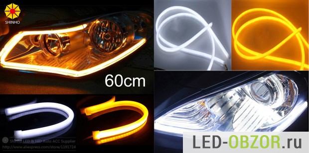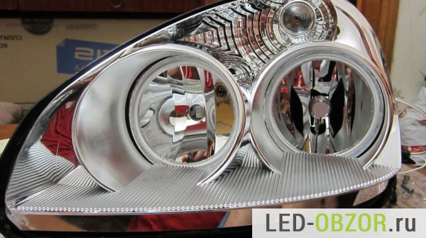 Еще один из способов, это применить гибкую световую трубку, которая чаще всего вставляется в фары в качестве габаритных огней. Трубку можно обрезать и сделать кольцо, форму оно будет держать за счёт контакта с отражателем. Двухцветная трубка сможет выполнять функцию габаритов и сигналов поворота.