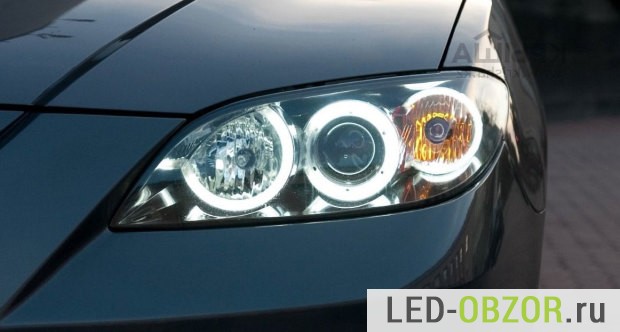 Среди импортных автомобилей популярны ангельские глазки на Мазда 3, Mazda 3. Особенно шикарно смотрятся на Мазда 6, у которой в каждой фаре по 4 круга. Интересно будут смотреться светодиодные кольца RGB, которые будут дополнять габариты и сигнала поворота.