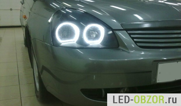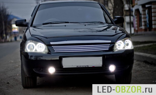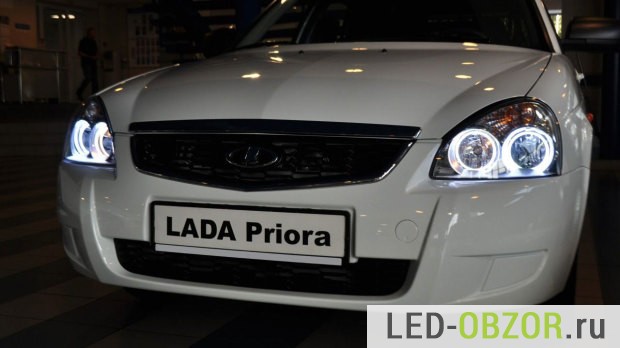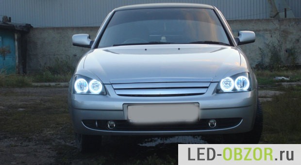 Самый популярный вариант в России, это ангельские глазки на приору. Форма фар хорошо подходит для такого тюнинга, отражатели имеют круглую форму.