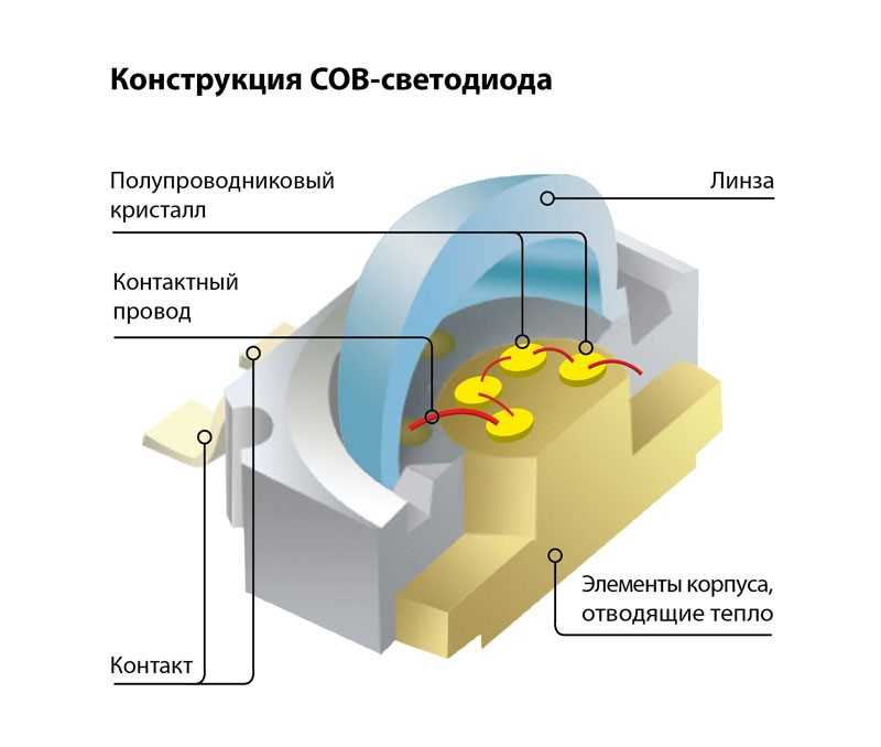 Следующим осветительным поколением стали chip on board (COB) модели. По этой технологии на подложке размещается больше кристаллов, чем в SMD—конструкции. Как результат – на порядок больший световой поток.