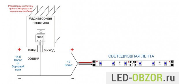 Бортовая электрическая сеть автомобиля официально рассчитана на 12 вольт. Но реальное напряжение может достигать 14,5В и выше. Светодиодная лента рассчитана ровно на 12В, и эти 14,5 вольт будут очень негативно сказываться на режиме работы светодиодов.