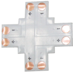 - точно по концу светодиодной ленты выставить соединитель, приклеив его к верхнему слою двусторонней клейкой ленты;