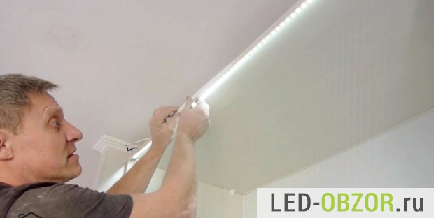 Чаще всего этот способ применяется при установке на обычный или двухуровневый. Место монтажа зависит и от вашей фантазии. Я видел дизайн проекты, где светодиодная подсветка крепиться внутри натяжного, диоды просвечивают через пленку, получается светят как звезды.