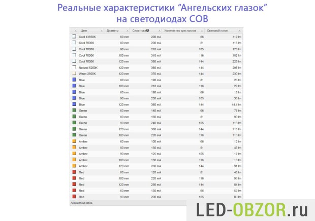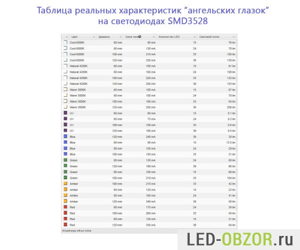 Китайские и отечественные продавцы завышают параметры и обещают невероятную яркость. В качестве примера покажу таблицу реальных характеристик для 3528.