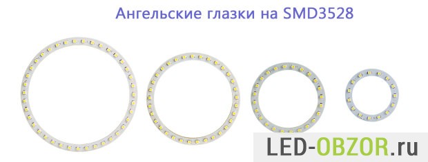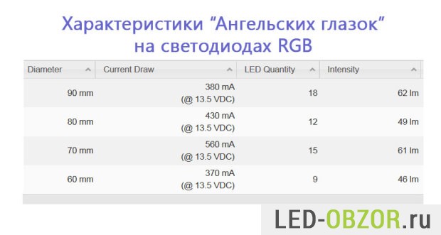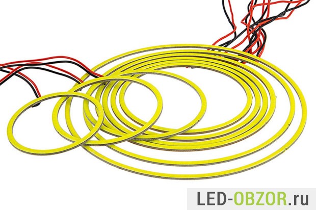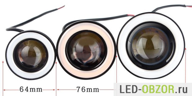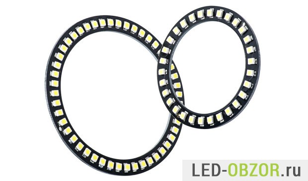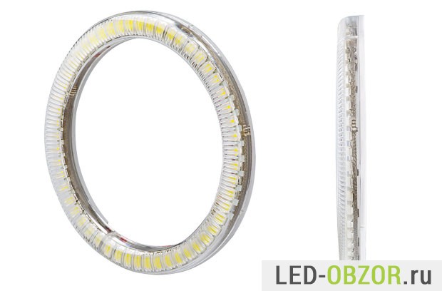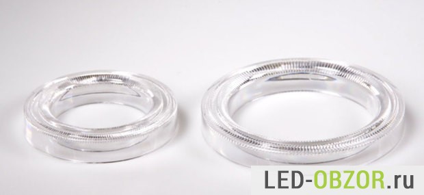 Размеры могут быть абсолютно разными, чем больше диаметр, тем выше мощность. Стандартный диаметр от 60мм до 160мм, шаг размерности 10мм. Ширина зависит от модели светодиодов, SMD или COB. Чтобы SMD светодиоды вблизи не просматривались через стекло фары ближнего света, на кольцо ставят рифлёный рассеиватель. Он делает свет от отдельных SMD диодов более равномерным, чтобы точки не выделялись.