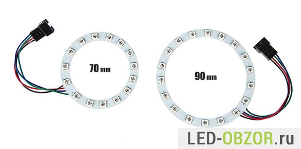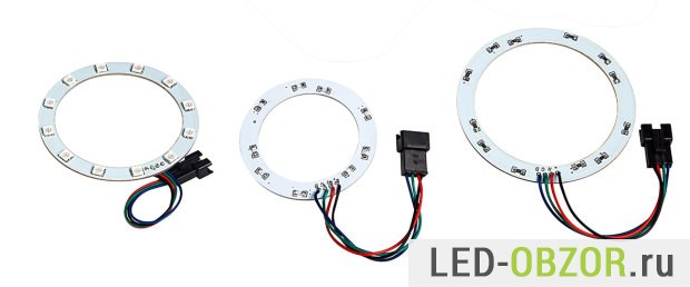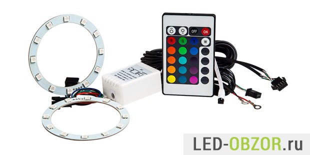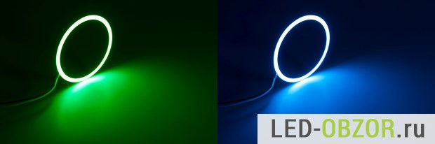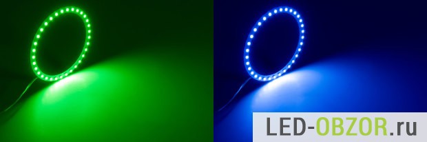 Если вы не можете определиться с цветом, то вам подойдут светодиодные кольца на трехцветных светодиодах RGB SMD5050. В каждом установлено по 3 кристалла разного цвета, красный, синий, зелёный. При помощи контроллера цвета смешиваются и можно настроить любой цвет. Используется стандартный RGB контроллер от светодиодной ленты. Кроме постоянного цвета в нём есть постепенная смена цветов по одной из заложенных программ. Габаритные огни будут переливаться различными цветами, могут мигать разным цветом, менять яркость.