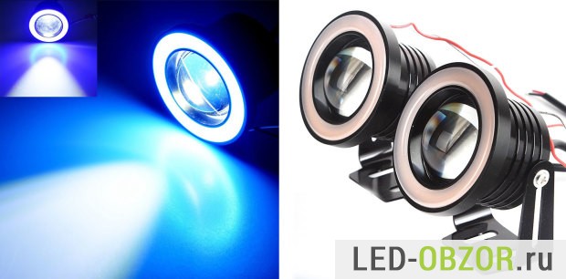 Противотуманные фары с ангельскими глазками можно купить готовые или установить самостоятельно. Китайцы продают несколько линзованных моделей на COB светодиодах 10W. По сути они не являются противотуманками, потому что не имеют светотеневой границы. Световое пятно круглое, как от фонарика, и больше подходит для использования в качестве ДХО.