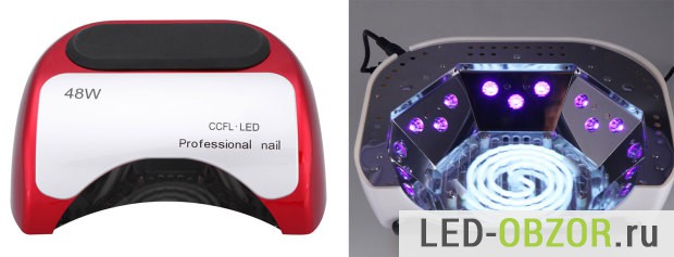 Главное отличие профессиональных led ламп для сушки ногтей, это более высокая мощность. Домашние CCFL на 9 ватт, для салонов красоты на 18 Вт, 36 Вт, 72 Вт. Когда делается наращивание или маникюр шеллак, толщина гелевого слоя может быть значительной, чтобы его просушить требуется больше УФ света. Можно приобрести простой, до доработать его за 500р. до мощного на 36-40 Вт.