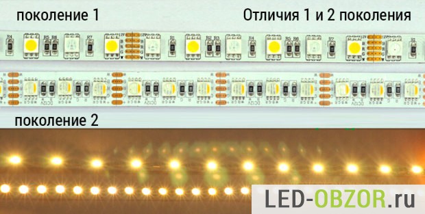 В первом поколении чередуются обычные белые и RGB светодиоды. Белый светодиод может стоять любой мощности от 3528 до 5630.