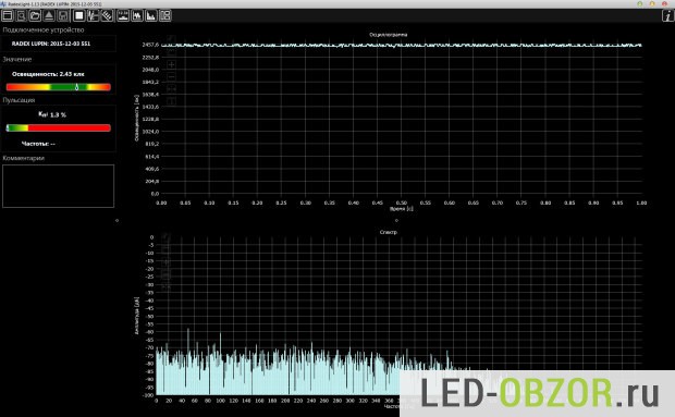 На упаковке написано, что пульсации отсутствуют, то есть они должны быть около 1-2% с учетом погрешности прибора Radex Lupin. Этот показатель соответствует обещанным 1% от изготовителя. У лампочки накаливания пульсации обычно 15-17%.