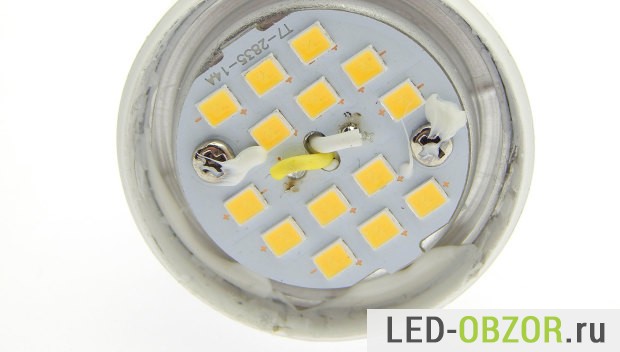В данной модели использованы 14 светодиодов в формате SMD 2835 на 0,5W. Самая популярная мощность для 2835 это 0,2W, но это всего лишь обозначение корпуса, кристалл может быть установлен любой, от китайского на 0,05W до фирменного на 1W. В данной модели диода установлено 2 кристалла, под люминофором это видно. Сделать приличное фото кристаллов не получилось, нужен объектив для макросъемки.