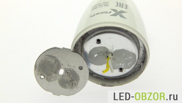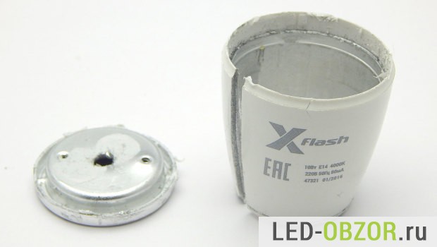 С одной стороны в цилиндр запрессована крышка, на которую крепятся led диоды. Достать её никак не удалось, она начинает гнуться. Пришлось спиливать цоколь и затем сделать распил вдоль изделия.