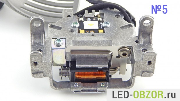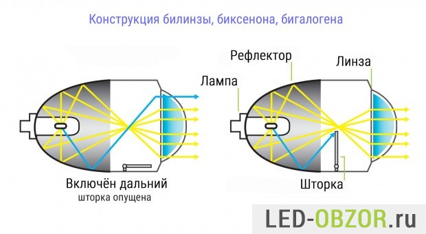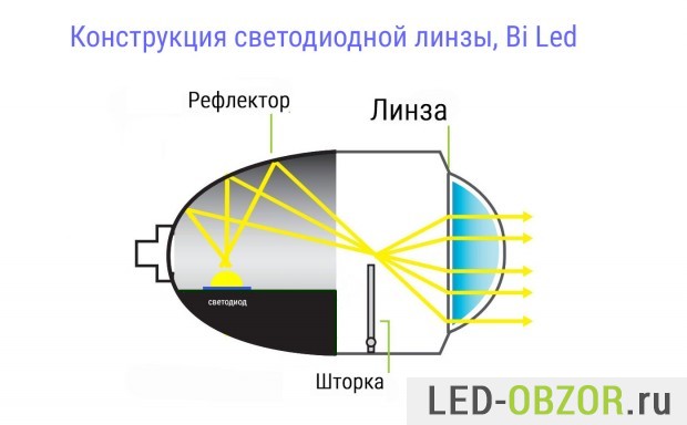 Конструктивно светодиодные линзы схожи с биксеноном и бигалогеном. Только у Bi Led модуля свет направлен в верхнюю часть отражателя. Край шторки задаёт светотеневую границу.