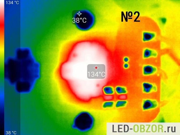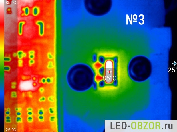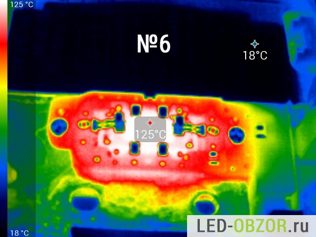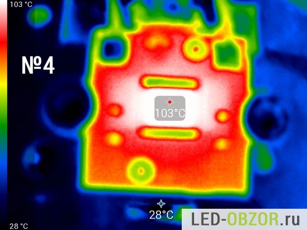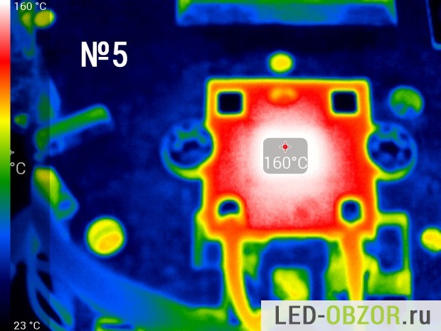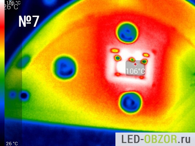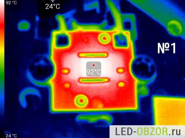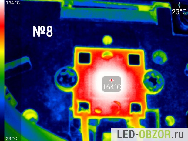Температуру нагрева светодиода замеряем тепловизором после прогрева в течение 1 часа. Коэффициент эмиссии на тепловизоре установлен 0,8. По спецификациям от Cree показатель излучения для силикона составляет 0,85. По особенностям замера консультировался у Osram, Cree и других производителей. Коэффициент может отличатся в большую или меньшую сторону в зависимости от изготовителя, поэтому в таблице представлены усреднённые результаты. Конструкция состоит из разных материалов с разным значением теплового излучения, поэтому выложу только снимки диодов.