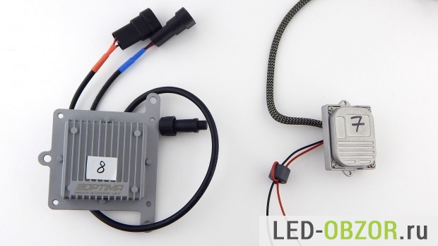 Образцы №1, №4, №5, №8 имеют практически одинаковую конструкцию, которая хорошо зарекомендовала себя и используется в Bi Led Optima. Драйвер у них внешний, больших габаритов с отверстиями для крепления. Блок питания малых габаритов у №2 и №7, он сможет легко разместится внутри фары.