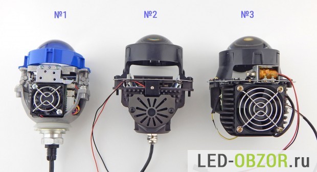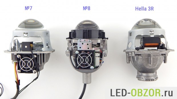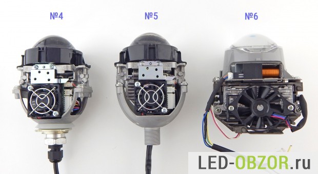 Почти на всех образцах установлена линза диаметром 3 дюйма из стекла, только Bi led Koito имеет пластиковую. Цена Koito почти в 2 раза выше аналогов, таким образом они пытаются снизить стоимость, у пластика нет преимуществ по сравнению со стеклом. На Който установлен вентилятор Panasonic и другие фирменные комплектующие, что должно максимально продлевать срок службы.