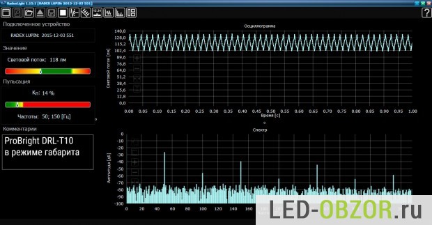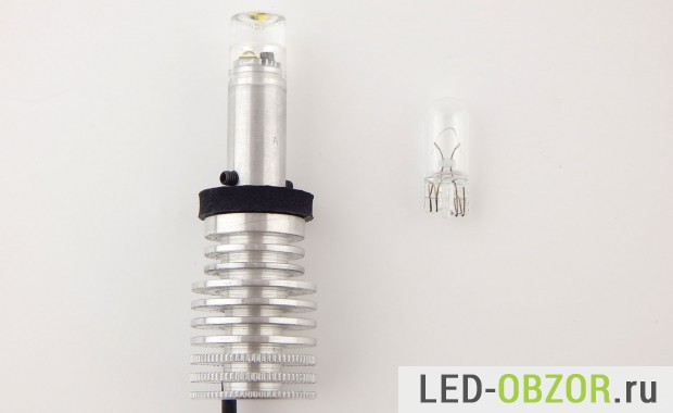 Штатная лампочка накаливания с цоколем W5W T10 имеет 50 люмен, образец светит на 118 лм, ярче на 136%. Для измерения светового потока используется фотометрический шар.
