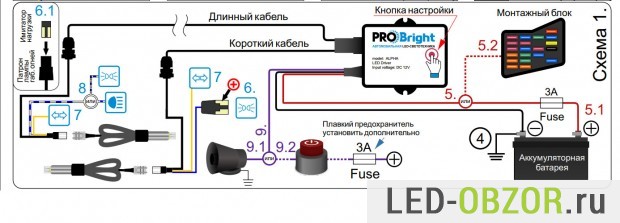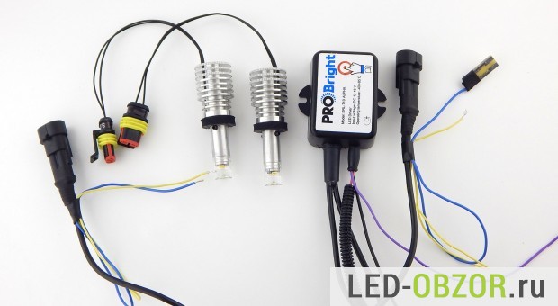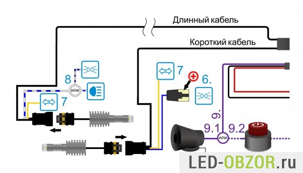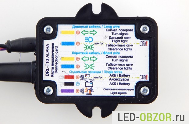 От блока управления идут 2 кабеля с разъёмами на конце для подключения светодиодных ламп. От каждого разъёма выходит по 2 провода. В зависимости от ваших потребностей они подключаются к габаритам, поворотникам, ближнему и дальнему свету