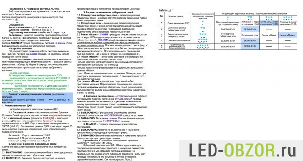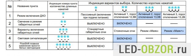 Все режимы настраиваются при помощи одной кнопки на контроллере, подробное описание в таблице. Основная настройка, это выбор напряжения, при котором включаются DRL. В зависимости от износа аккумулятора и состояния электрики автомобиля.