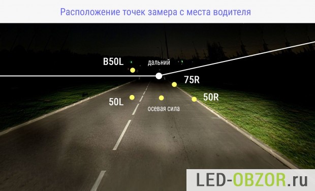 Для сравнения разных источников света используется ГОСТ, который регламентирует основные точки замера освещённости по таблице, размещённой на стене. Число в обозначении точки равно её удалённости от автомобиля. Буквами L и R обозначается расположение, лево и право.