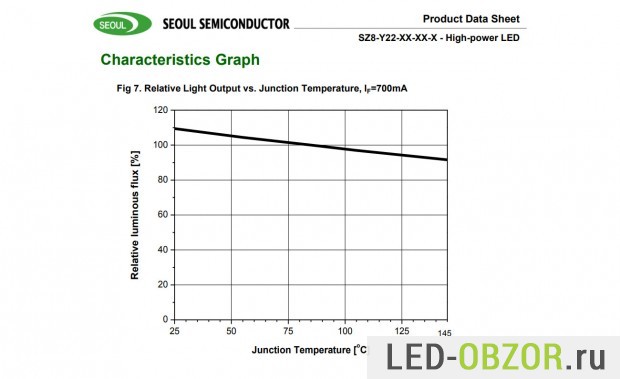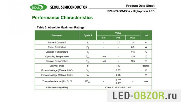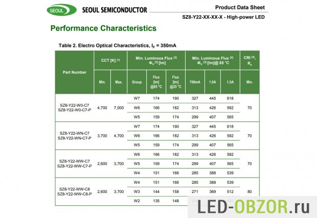 В качестве примера приведу характеристики светодиодов CSP от Seoul Semiconductor серии Z8Y22.