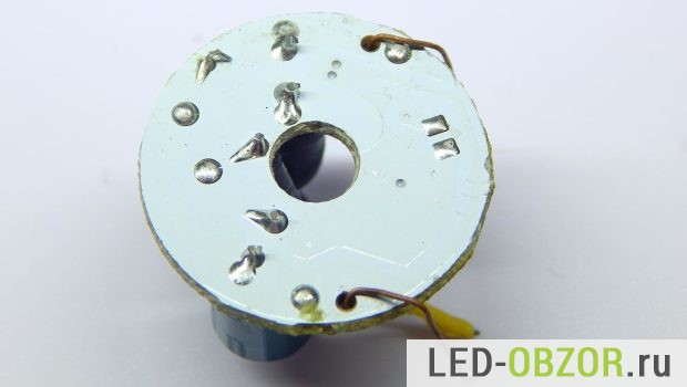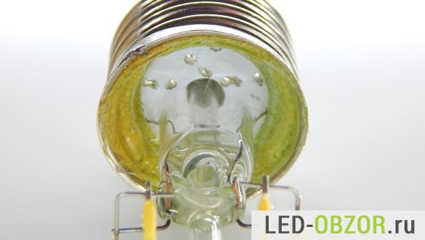 В разборке участвует модель на 6Вт. Электрическая часть состоит из 2 блоков ЛЕД филаментов, подключенных последовательно. В каждом блоке 3 диода подключенных параллельно.