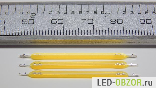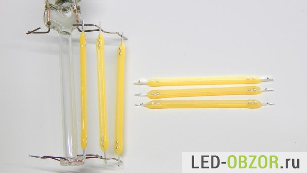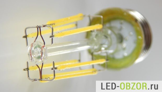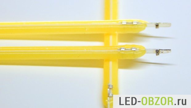 Нитевидные светодиоды представляют из себя множество led кристаллов, расположенных на одной длинной и узкой подложке и подключенных последовательно. Это как отрезок светодиодной ленты в миниатюре, сверху они покрыты желтым люминофором.