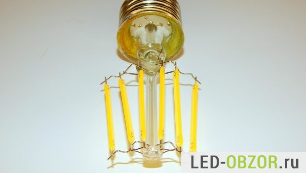 На первый взгляд образец простой, как три рубля, только вместо нити накала желтые спички вставлены. На самом деле это полный аналог обычной светодиодной лампы, но слегка упрощенный конструктивно.