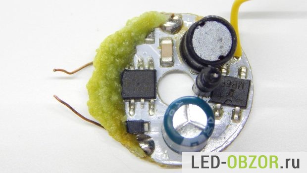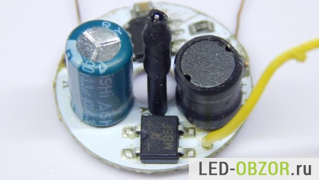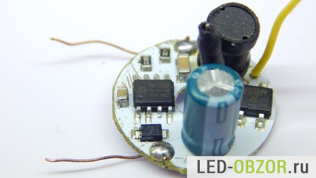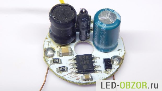 Блок питания образца на 6W, называемый драйвер, находится в самом цоколе. Использование интегральных стабилизаторов напряжения и тока позволило сделать их размеры миниатюрными. А высокий КПД снижает нагрев стабилизатора.