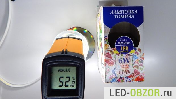 Главное отличие от классических «внутреннего сгорания», это отсутствие нагрева колбы. Если раньше при попадании воды лампочка взрывалась из-за перепада температур, то тут ничего не произойдёт. Прогреваем в течение 30 минут до рабочей температуры. Замеры проводим в положении цоколем E27 вниз, чтобы узнать максимальный нагрев колбы, ведь тепло поднимается вверх. В большинстве случаем она эксплуатируется в цоколем вверх.