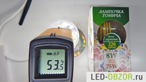 Для 6Вт получилось 52,8°, для 8Вт показал 53,5°. площадь колбы достаточно большая, остывать должна хорошо.