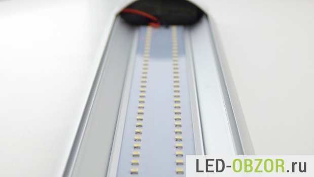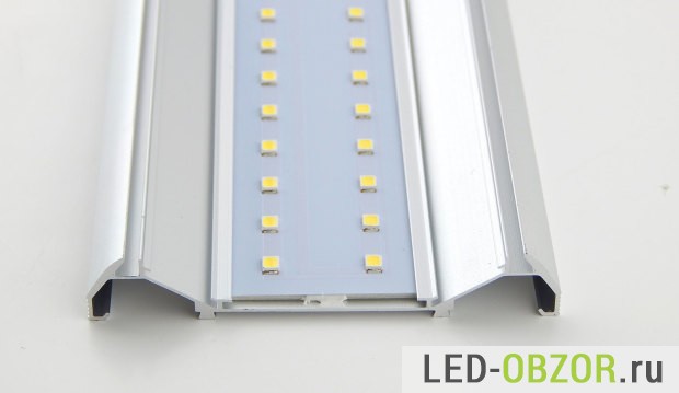Конструкция линейного светодиодного светильника очень простая. На алюминиевый профиль, который является корпусом, установлена линейка со светодиодами. От ослепления защищает матовой рассеиватель. В торце установлены пластиковые заглушки, внутри одной расположен драйвер.