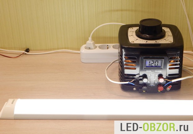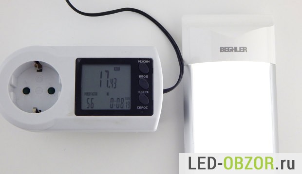 Перед проведением измерений энергопотребления прогреваем линейный светодиодный светильник до рабочей температуры в течение 60 минут. При сильном нагреве потребление энергии падает в среднем на 2 ватта, потому что вольтамперные характеристики светодиодов меняются. У данной модели показатель составил 0,6W.