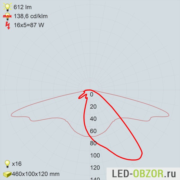 Чтобы узнать, каким образом оптика распределяет свет через линзы, рассмотрим диаграмму направленности света, еще называют кривые силы света. По изображениям видим, что свет распределяется влево и вправо от уличного led прожектора. Назад не светит, там обычно подсветка и не требуется.