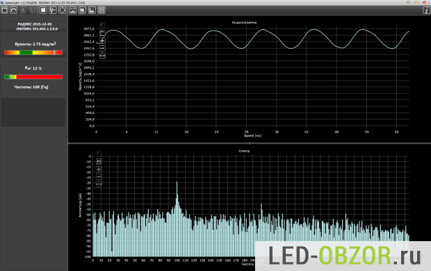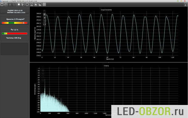 Радекс Люпин подключаем через USB к компьютеру и запускаем программу для снятия расширенных показаний с него. На изображении видим осциллограмму пульсаций и спектр по частотам. На спектре на частоте 100 Герц видим более высокий уровень спектрограммы. В зависимости от качества драйвера, кроме 100Гц пульсаций могут быть и на 200Гц., но в нашем образце этого нет.