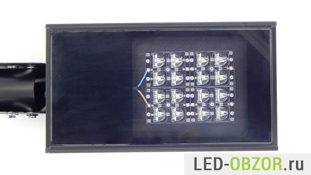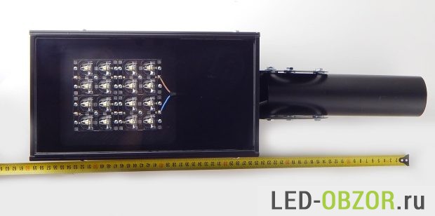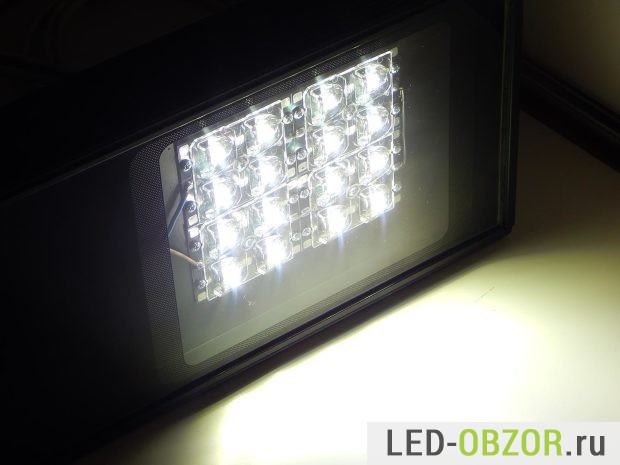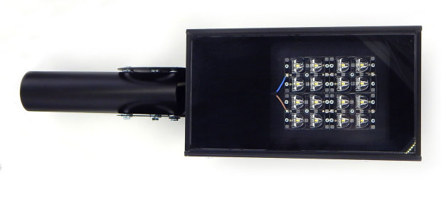 Световой поток прожектора для уличного освещения обеспечивают 16 светодиодов Cree XM L2, оснащенных вторичной оптикой для необходимой диаграммы распределения света. В данном образце это освещение садово-парковых зон без подсветки позади столба.