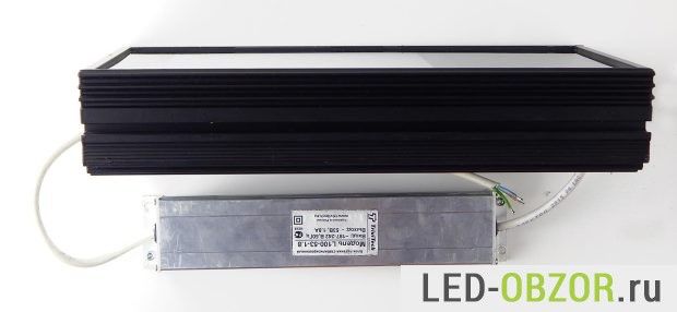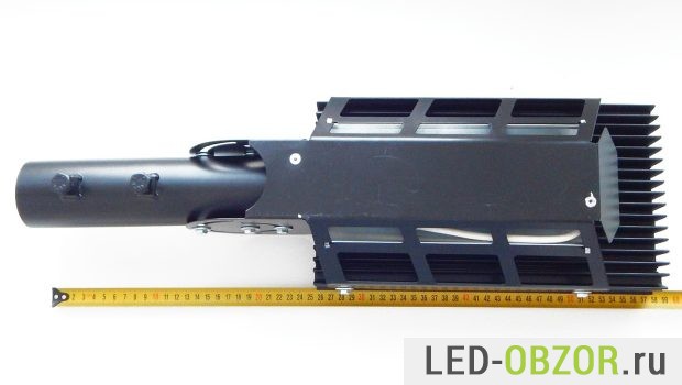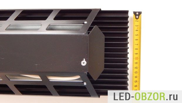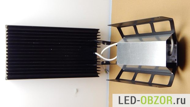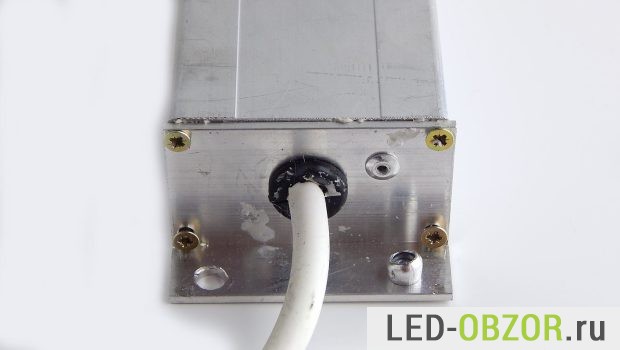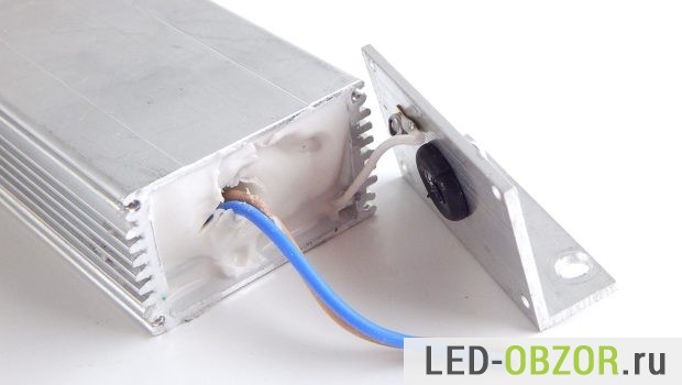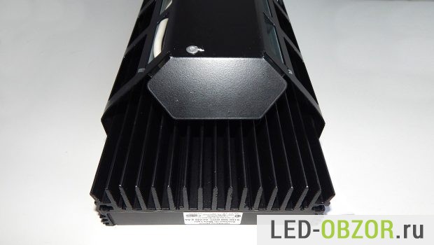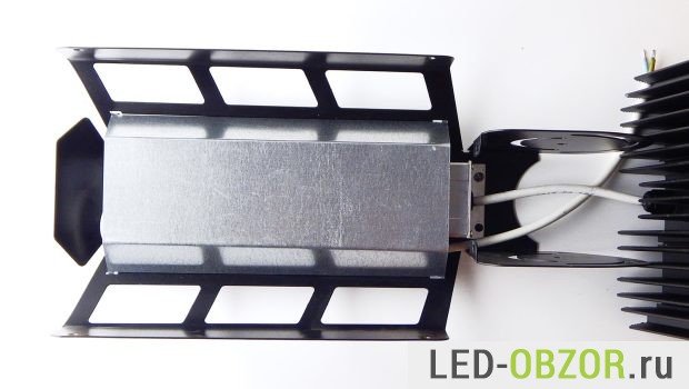 Драйвер находится на задней части под защитным металлическим кожухом, к которому приклёпан на 2 заклёпки из алюминия, пришлось их высверливать. Корпус выполнен из алюминия с небольшим оребрением, которое больше выполняет функцию по повышению жесткости корпуса, чем по отводу тепла. Начинку достать не удалось, она полностью залита резиноподобным герметиком. Ломать и пилить корпус слишком долго, да повредить элементы можно будет легко. При снятии торцевой крышки видно, что корпус заземлен отдельным проводом.