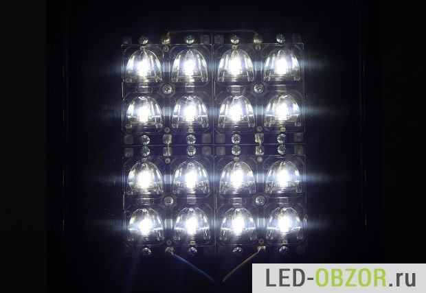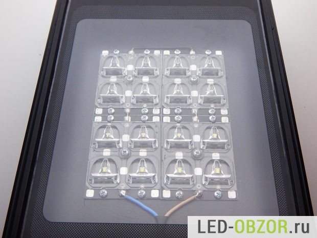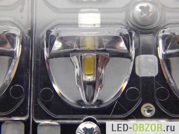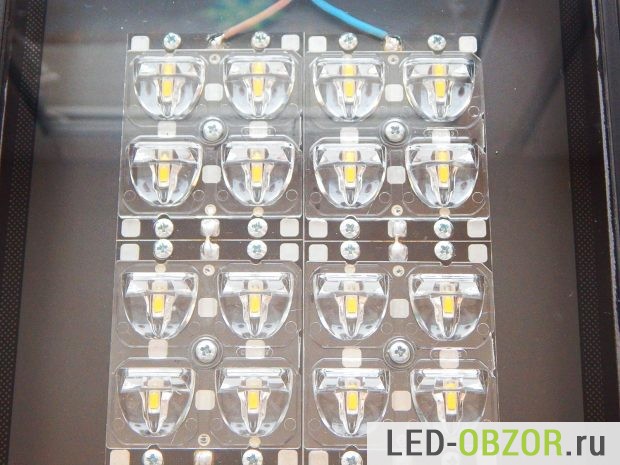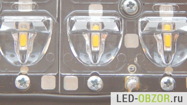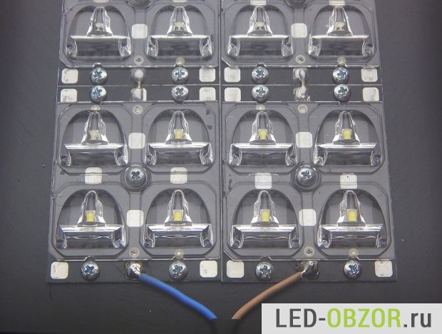 Диоды установлены модулями, на каждом по 4 штуки. Каждый фиксируется 5 болтами, по краям и по центру, это самый надежный способ, надежней не бывает. Линзы тоже в виде модулей, на каждой пластинке по 4 штуки, что ускоряет процесс сборки.
