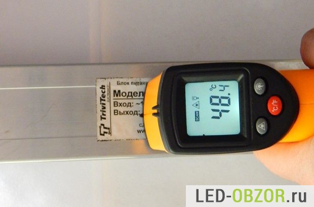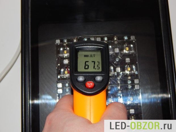 Предварительно прогреваем светодиодный светильник для улицы в течение двух часов до рабочей температуры в комнатных условиях +20°. Замерим нагрев задней части радиатора и переднего стекла.