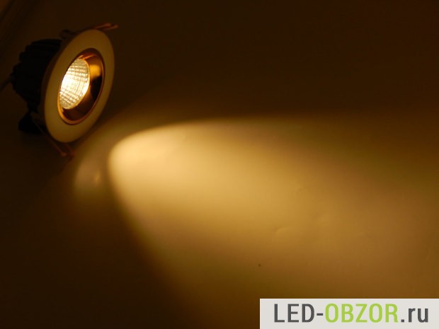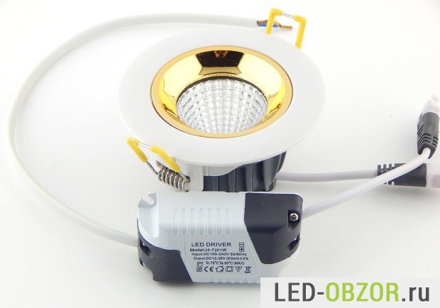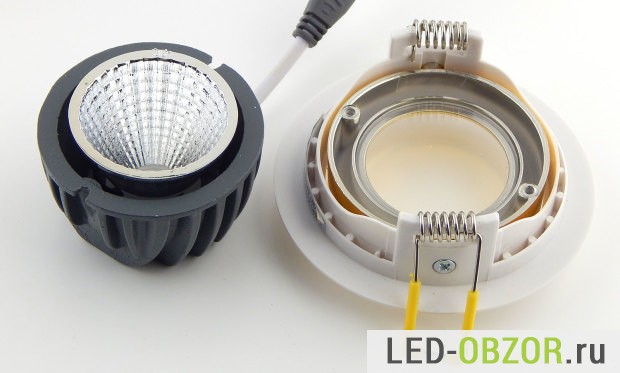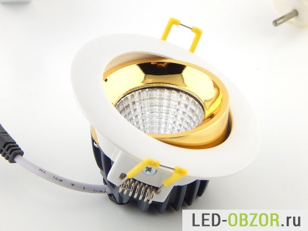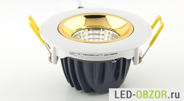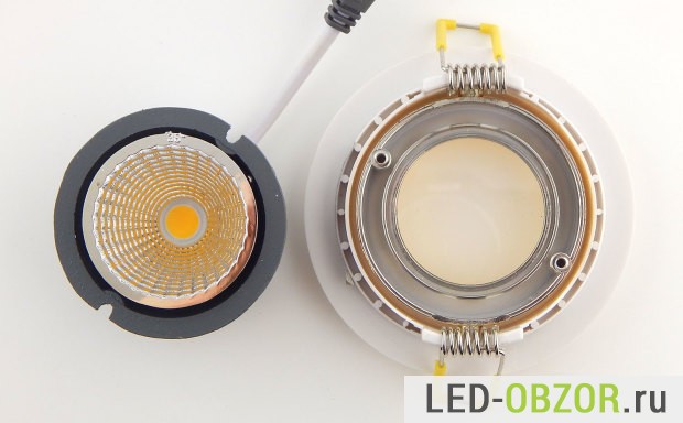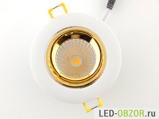 Технические характеристики встраиваемого светодиодного светильника определяются COB светодиодом. Судя по размерам и мощности, это не дешевая китайская имитация COB диода. Под желтым люминофором видно установленные кристаллы, по их размерам можно судить о реальных значения мощности и долговечности. Технология COB на одной подложке размещены множество кристаллов. Основное отличие, это улучшенный отвод тепла от кристаллов по сравнению с SMD.
