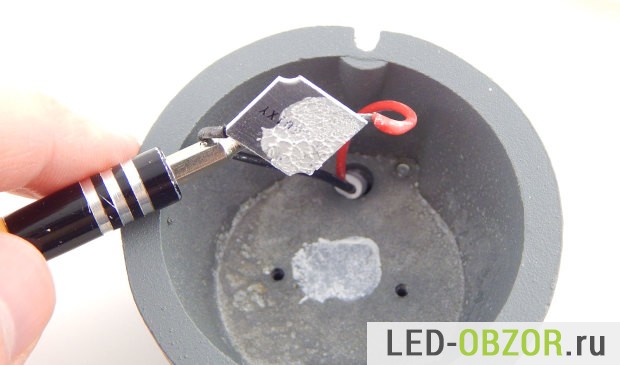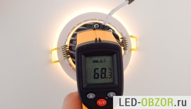 Температуру корпуса и светодиода проверяю в рабочем положении, если бы он располагался на потолке. Прогреваем в течение 1 часа. Разница по нагреву диода и корпуса покажет насколько хорошо отводится тепло. Количество термопасты достаточное, она улучшает контакт с корпусом точечного светодиодного светильника. Но смущает внутренняя поверхность, куда ставится светодиод. Она очень неровная, шероховатая, хорошего контакта скорее всего не будет, измерения покажут точный результат.