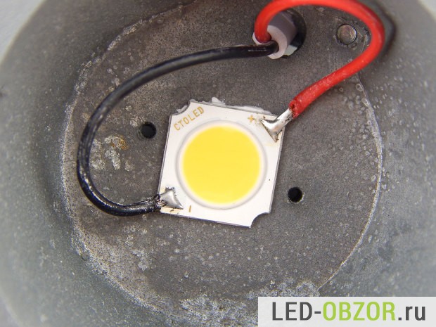 Использование COB светодиода позволяет максимально уменьшить габариты. Основную часть занимает отражатель, который фокусирует свет диода, который имеет угол свечения в 120°.