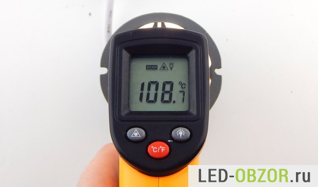 Рабочие характеристики диодов определяются по температуре кристаллов. Она обычно на 10° выше, чем нагревание пластины и внешней стороны. Пирометр показал 108° на светодиоде, добавим 10°, получится 118° нагрев кристалла. Много это или мало можно узнать только по спецификациям COB LED.