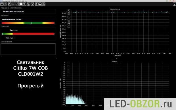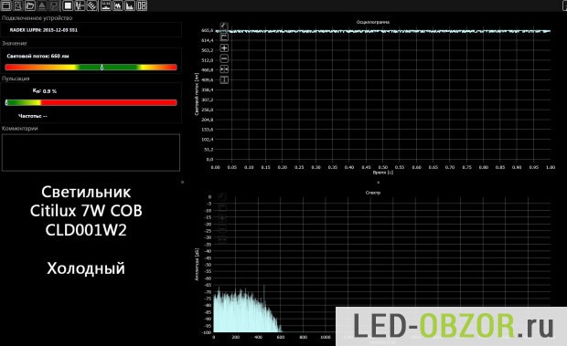 Коэффициент пульсаций около 1%, показатель в пределах погрешности прибора Radex Lupin. То есть, пульсаций светопотока совсем нет. Драйвер хорошо справляется с нагрузкой.